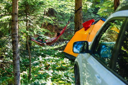 woman laying in the hammock tent and car on background reading book