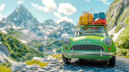 A vibrant vintage green car loaded with colorful luggage sits on a scenic road, surrounded by majestic mountains, inviting adventure and exploration.