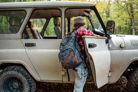 A young Caucasian woman with a backpack climbs into a jeep. Trees in the background. Rear view. Concept of car travel and tourism.