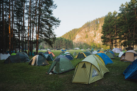 Golden hour twilight camping in the illuminated pine forest with tents under the sunset rays, offering a serene and tranquil outdoor adventure and recreation in the wild habitat of nature