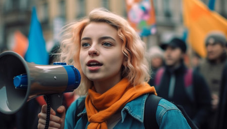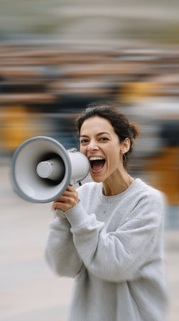 Young adult woman holding megaphone, shouting with joy in city protest generated by artificial intelligence