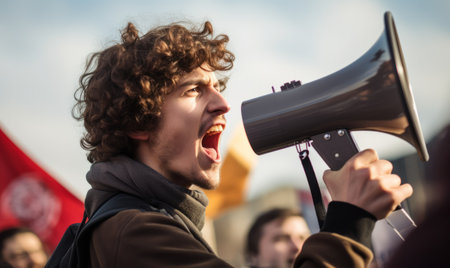Young activist in a protest, shouting in a megaphone. Demonstration