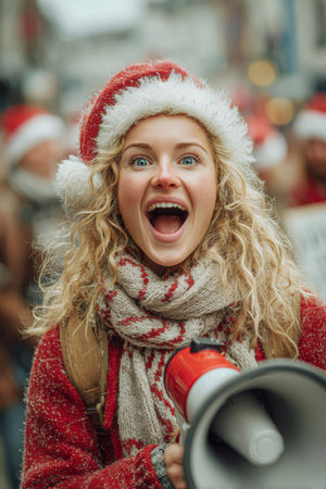 Excited woman in festive outfit leading a Christmas parade with a megaphone in a winter street