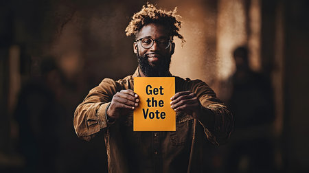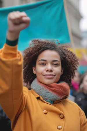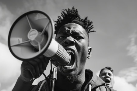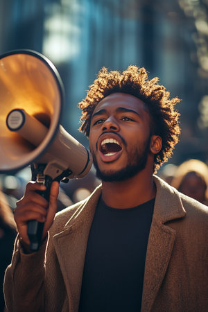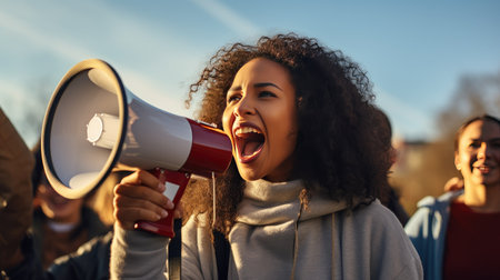 young, determined activist holding a megaphone and inspiring others to join the movement for social justice and equality.