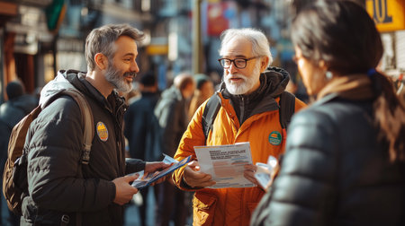 Two male volunteers handing out campaign materials to pass by in a crowded street, promoting a cause or election