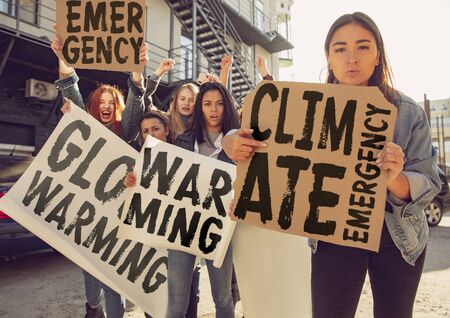 Demonstrators protesting against climate change, young people from different culture and race fight for climate change. Global warming and environment concept. People holding climate change banners