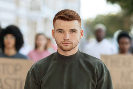 Human rights. Group of activists giving slogans in a rally. Caucasian men and women marching together in a protest in the city. Look angry, hopeful, confident. Blank banners for your design or ad.