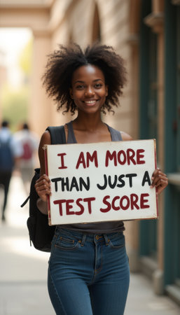 A vibrant young Black woman stands proudly in an urban setting, holding a sign that boldly declares her worth beyond academic achievements. Her radiant smile and natural hair exude confidence, while the background hints at a bustling campus atmosphere, emphasizing the importance of individuality and self-worth.