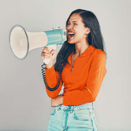Mixed race woman isolated against grey studio background with copyspace and using megaphone. Young hispanic standing alone and protesting and promoting empowerment. Model showing support and arguing