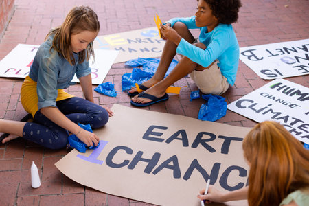 Happy diverse schoolchildren making ecology posters during outdoor school art class. Education, creativity, school, protest, activism and ecology concept.