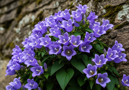 Dense cluster of vibrant lavender purple bellflowers campanula blooming profusely. the bell shaped flowers and green foliage contrast sharply against the rough, moss covered texture of an old stone wall.