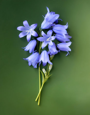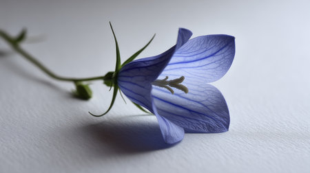 A delicate bluebell flower on a soft white canvas, with only a hint of green stem to create a minimal desig.