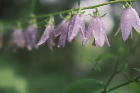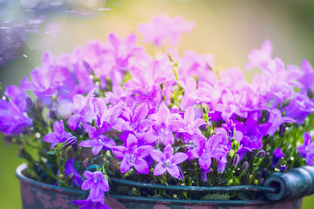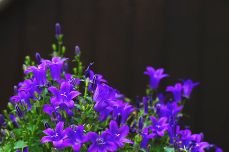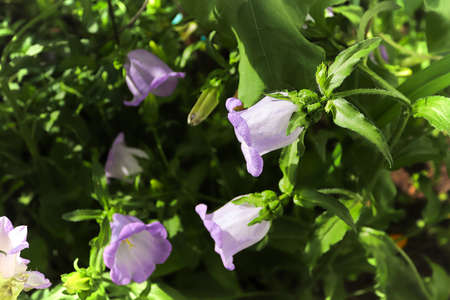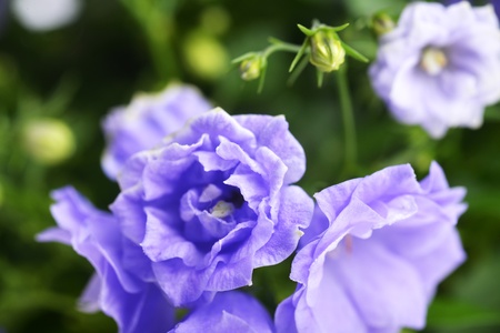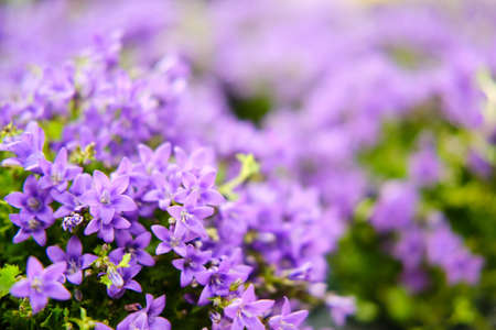 Close-up of Campanula, purple bell flowers in summer garden. Background