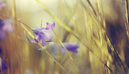 Harebell summer wildflowers - Campanula. Field blue flowers at sunset.