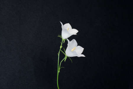 close-up of Campanula or bellflower flowers on white background with copy space. floral macro. spring and summer border template . greeting and holiday card or postcard
