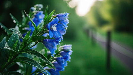 Close-up of bright blue flowers with water droplets, highlighting detailed textures and color contrast. The composition features a natural outdoor environment, with soft sunlight creating bokeh effects in the background. Suitable for various editorial and commercial applications, the image evokes a sense of freshness and natural beauty.
