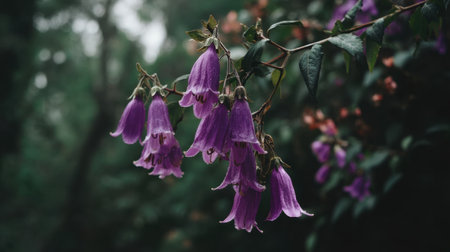 A serene depiction of elegant purple bell flowers cascading from branches, nestled in a lush garden environment, showcasing natural beauty.