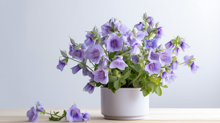 A close-up captures the ethereal beauty of purple bellflowers, their delicate petals hanging gracefully against a soft, blurred background, creating a dreamy, serene atmosphere.
