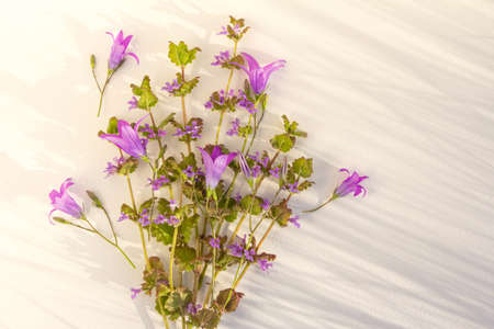 White background with copy space, grass shadows and bunch of wild purple meadow flowers. High quality photo