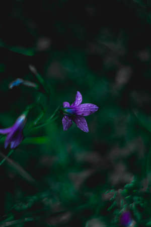Delicate purple bellflowers gracefully bloom, illuminated by gentle light against a dark, blurred background. The scene captures the essence of tranquility and natural beauty
