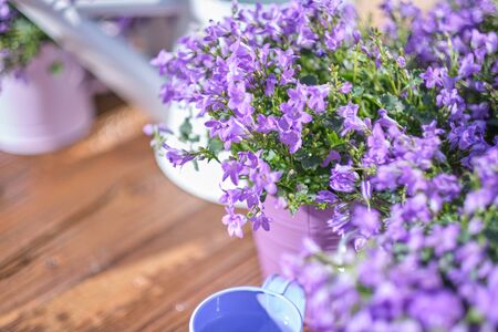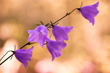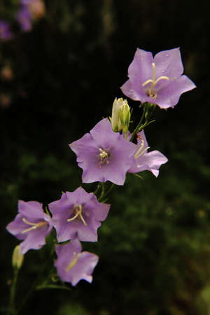 Bellflowers blooming in a cottage garden, closeup view, soft focus