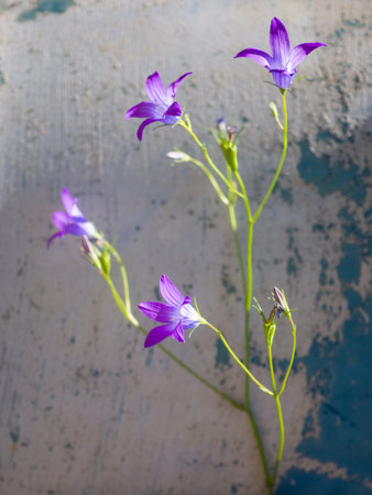 Purple Campanula bellflowers in grass by stone wall. Natural composition.