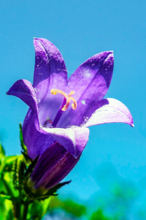 Blue flower blossoming close up trendy botanical background Campanula rhomboidalis family campanulaceae big size print high quality