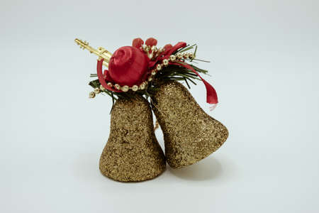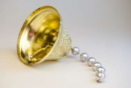 Lights of garland on a white background. Christmas decoration in the form of a golden bell on a white background.