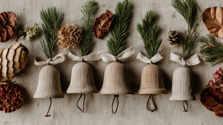 Experience the charm of elegant holiday decor featuring vintage bells, pine cones, and soft greenery. Ideal for creating warm festive vibes and beautiful designs.