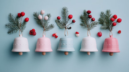 A charming arrangement of colorful ceramic bells featuring vibrant greenery and berries, perfect for enhancing holiday themes and adding a festive touch to any decor.