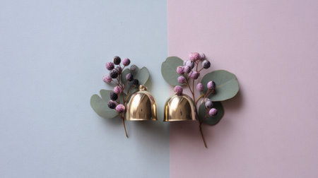 Capture the essence of elegance with these brass bells adorned with greenery and berries. Ideal for enhancing festive settings and creative projects.