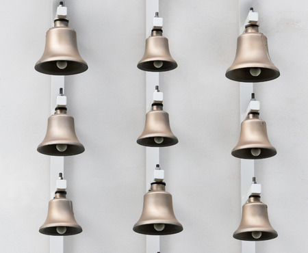 Detailed image of numerous stunning vintage gold Christmas bells as New Year decorations horizontal