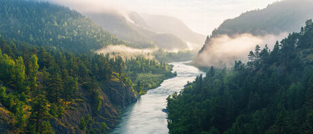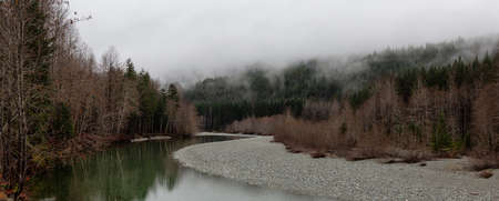 Mountain river in a foggy day. Panoramic view