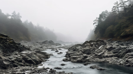 A river winds through a lush forest, with tall trees and scattered logs. The scene is bathed in soft, diffused light, suggesting a misty or overcast day. The composition features a naturalistic style with muted colors and a focus on textures. It is suitable for various commercial uses related to nature, environment, and travel.