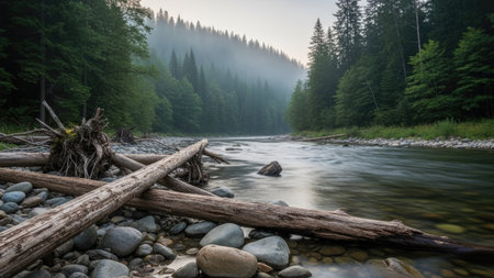 A river scene showcases a waterway winding through a forest with a misty backdrop. The image reveals a composition of water, trees, and rocks, with logs in the foreground. Natural light and colors depict an outdoor setting suitable for environmental or travel-related visual projects.
