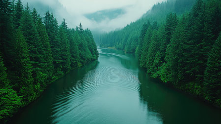 A tranquil river winds through a lush green forest, surrounded by towering trees and misty mountains, creating a serene and picturesque natural landscape.