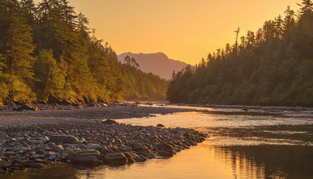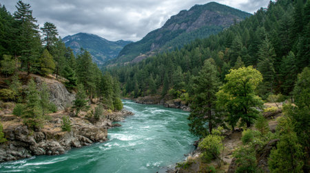 A tranquil river flows through lush green forests, reflecting nature beauty