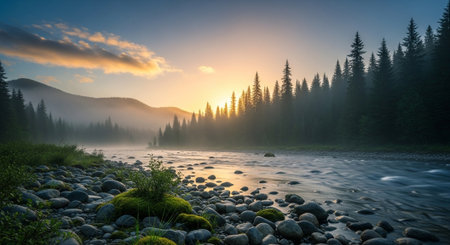 Sunset over a mountain river with rocks and trees in the foreground