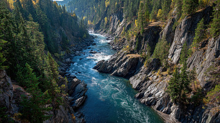 Experience the tranquil beauty of a serene river winding through a stunning forest canyon, complemented by rocky cliffs and vibrant autumn colors under a clear sky.