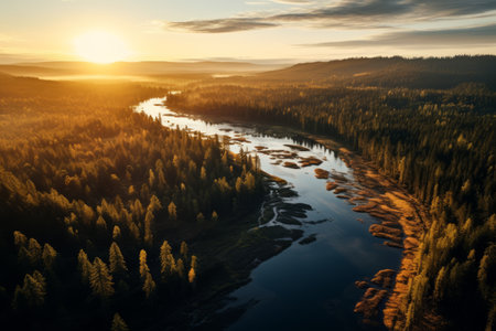 An aerial perspective captures a winding river snaking its way through a dense forest bathed in the warm, golden light of either sunrise or sunset. The sunlight filters through the lush green canopy, creating a dappled effect and illuminating the trees with a vibrant glow. The river's surface reflects the warm light and the surrounding foliage, adding to the serene and tranquil atmosphere of the scene. The vast expanse of the forest and the gentle curve of the river create a picturesque and...