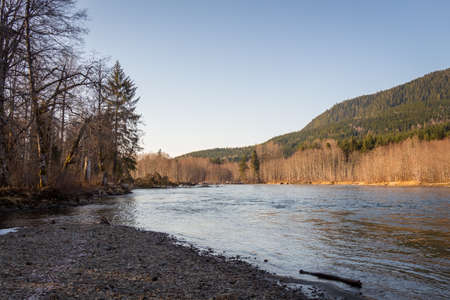 Looking downstream on the Kalum River at Deep Creek on a spring morning, near Terrace, Skeena Region, British Columbia, Canada