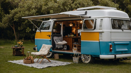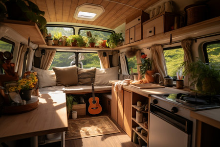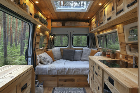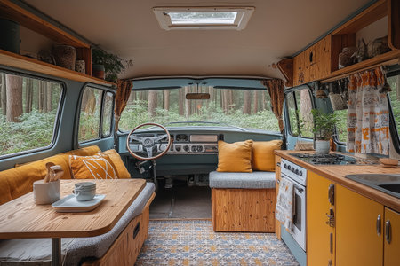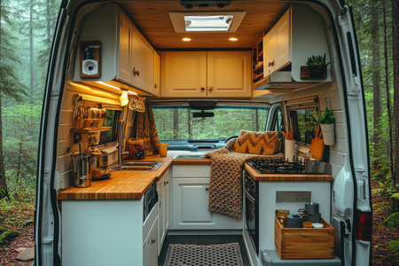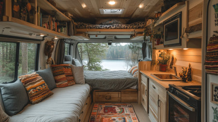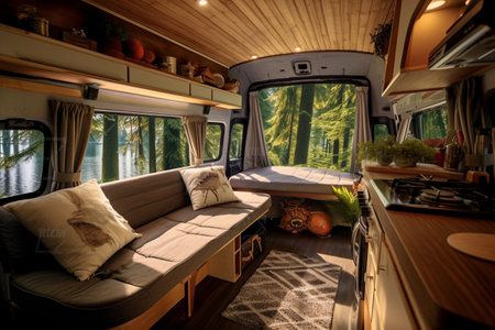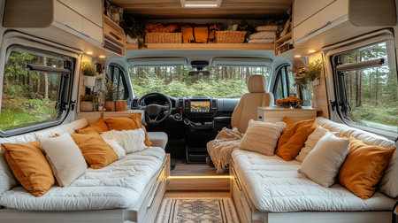 Cozy van interior showcasing elegant design with comfortable seating, warm decor, and natural light in a forest setting. Generative AI