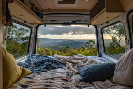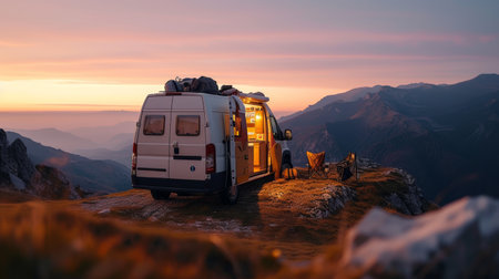 Cozy van interior showcasing minimalist design with scenic mountain view during golden hour in the great outdoors. Generative AI