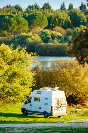 Camping on nature. Camper van at lake shore. Povoa e Meadas Dam in Castelo de Vide, Alentejo Portugal. Travel in motor home.