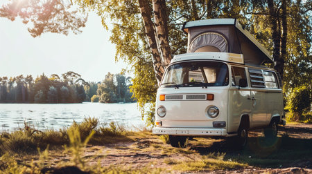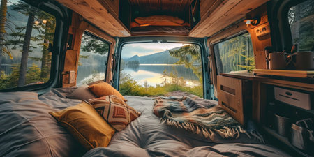 Cozy van interior offering a serene lakeside view surrounded by nature during the day in a tranquil setting. Generative AI