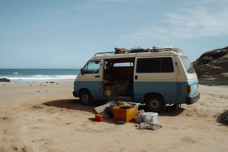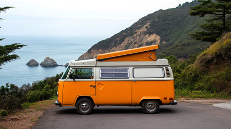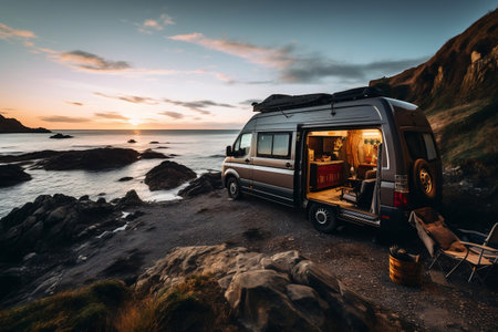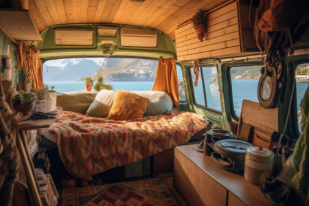 Cozy van interior with a stunning coastal view overlooking the ocean on a calm day. Generative AI
