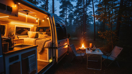An interior shot of a camper van with warm lighting illuminates a bed and kitchenette. Outside, a campfire burns, with a table set for dining. The scene uses warm and cool tones, hinting at a nighttime setting in a forest. This image could be used for lifestyle, travel, and adventure-themed commercial projects.