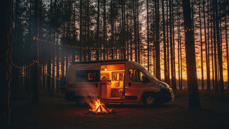 A camper van sits near a small campfire in a forest during twilight. The vehicle's door is open, revealing a warm, inviting interior. The scene features tall trees, soft lighting, and an overall sense of tranquility. Suitable for travel, lifestyle, and outdoor recreation concepts.