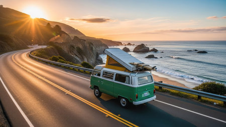 A green and white vintage camper van is traveling along a scenic coastal highway. The image shows a composition of a winding road along the ocean, capturing a vibrant sunset. The lighting highlights the textures and shapes of the landscape. Suitable for various applications in travel, adventure, and lifestyle concepts.