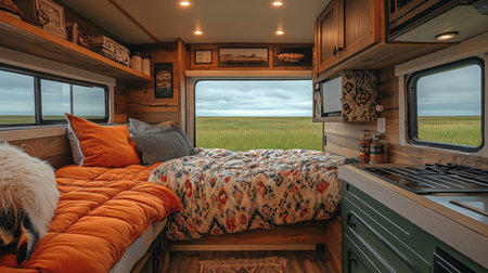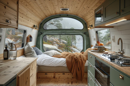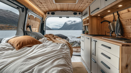 Cozy interior of a camper van with Scandinavian hygge style, featuring a bed and kitchen room, ideal for vacation trips